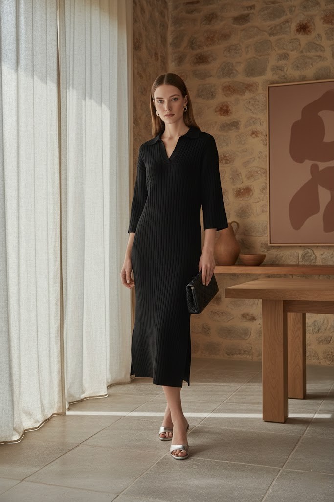 Kadın Camel Polo Yaka Geniş Fitilli Yırtmaç Detaylı Viskon Triko Elbise