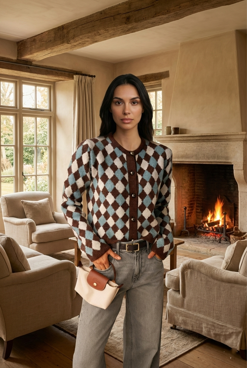Kadın Koyu Tarçın-Krem Bisiklet Yaka Baklava Desen Triko Hırka